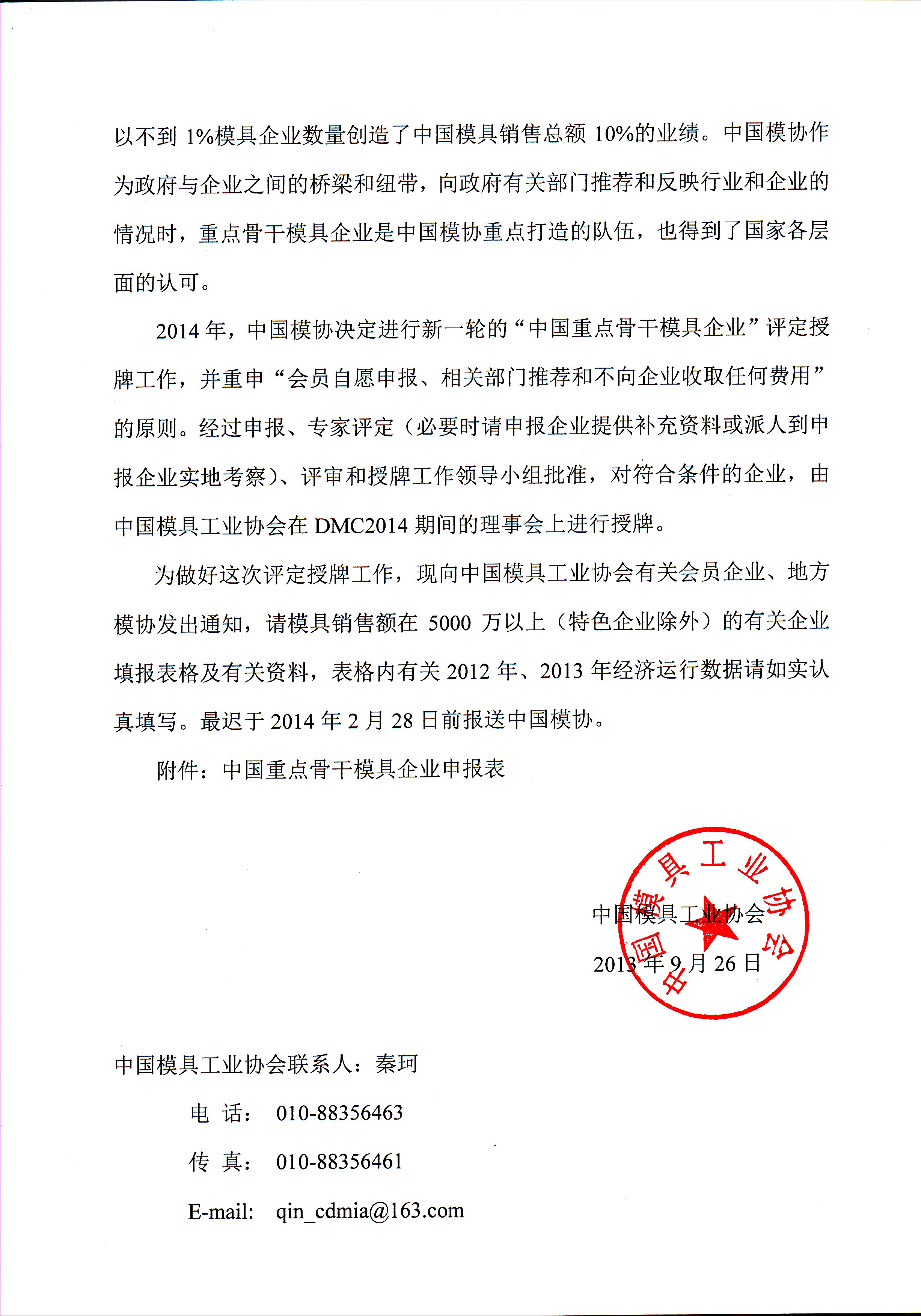 關(guān)于開展2014年“中國重點骨干模具企業(yè)”評定工作的通知