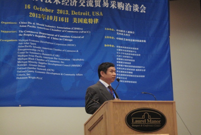 1,中國模具工業協會常務副會長兼秘書長武兵書做了“中國模具的現狀和發展前景”的報告。武兵書秘書長首先代表中國模協感謝本次活動的合作者和密歇根州政府經濟發展署簽發的邀請函,正是他們的積極努力和熱情支持,使得本次活動的中國代表團全部順利取得簽證并按計劃出席這次活動。隨后他介紹了中國模具工業概況,重點談了中國模具工業近30年的發展:建立了較完整的模具工業體系、模具產能及進出口增長迅速、中美模具(技術)貿易歷史悠久并發展勢頭強勁等。他在講演時還分析了中國模具市場,特別是汽車模具市場發展情況,歡迎美國三大汽車更多參與中國汽車模具技術和產品的交流和貿易。他還介紹了參加本次活動的中國模具企業。