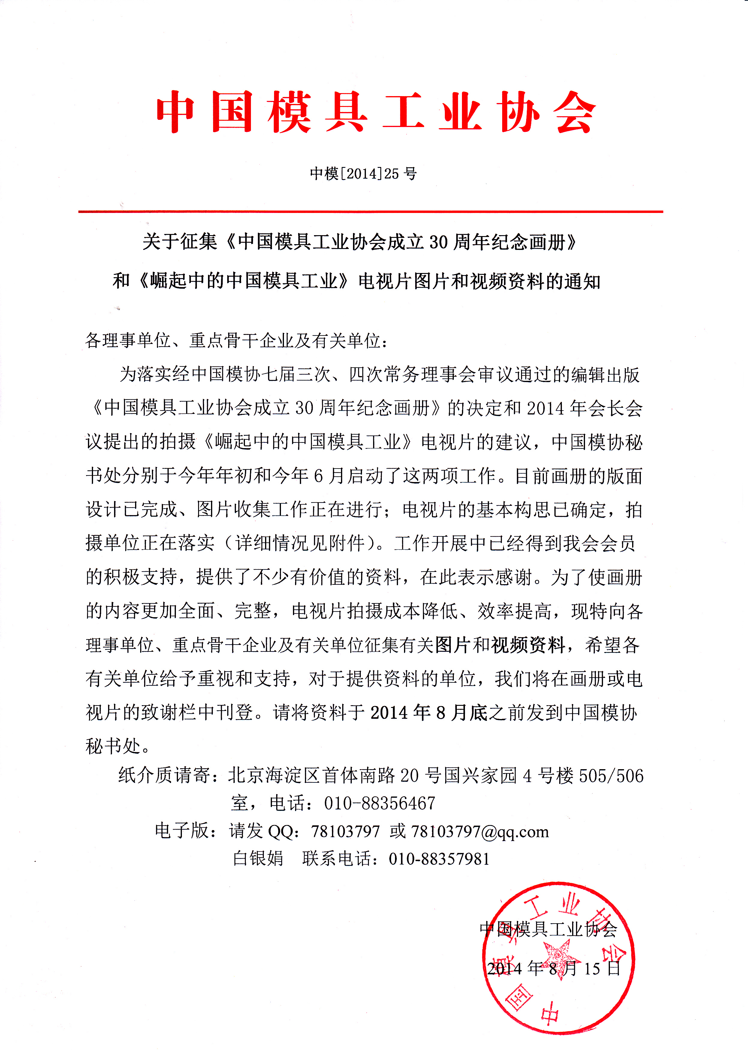關于征集《中國模具工業協會成立30周年紀念畫冊》和《崛起中的中國模具工業》電視片圖片和視頻資料的通知