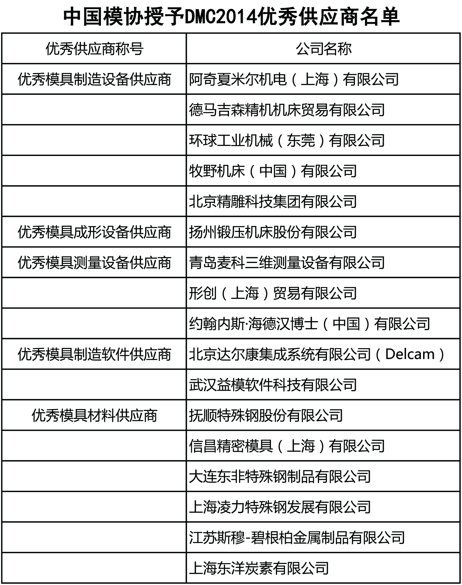 中國模具工業(yè)協(xié)會(huì)授予DMC2014優(yōu)秀供應(yīng)商名單