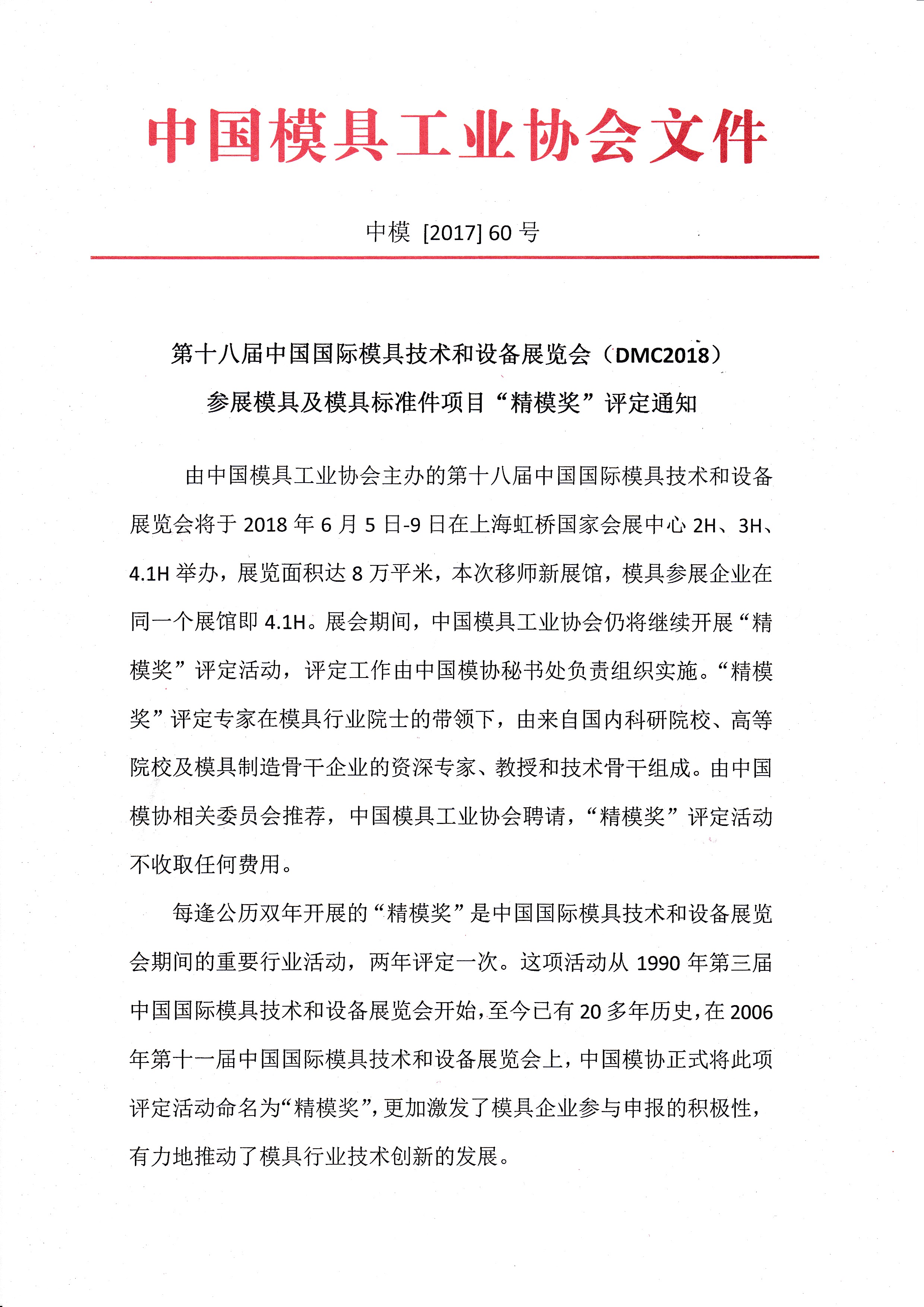 第十八屆中國國際模具技術和設備展覽會(DMC2018)參展模具及模具標準件項目“精模獎”評定通知