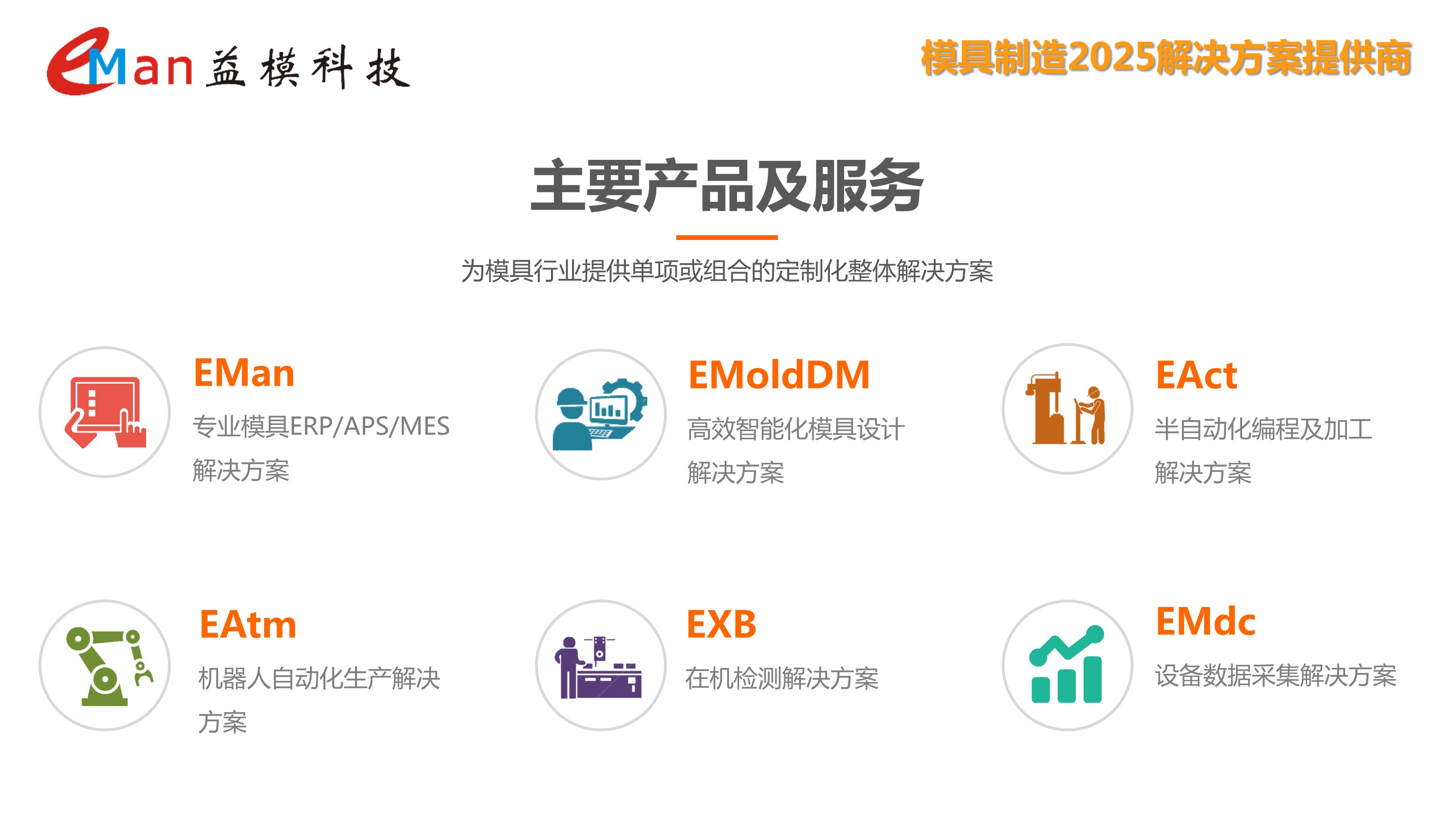 公司目前主要產(chǎn)品包括EMan 專業(yè)模具ERP/APS/MES;EMoldDM 高效智能化模具設(shè)計(jì)整體解決方案;EAct 模具/刀輔具半自動化加工解決方案;EAtm CNC/CMM/EDM全自動化加工單元解決方案;EXB在機(jī)檢測解決方案等產(chǎn)品及其技術(shù)服務(wù),產(chǎn)品應(yīng)用覆蓋汽車、家電、電子、手機(jī)/數(shù)碼、金屬制品、建材等各個行業(yè)領(lǐng)域,客戶遍布全國17個省市乃至德國、越南等海外區(qū)域。