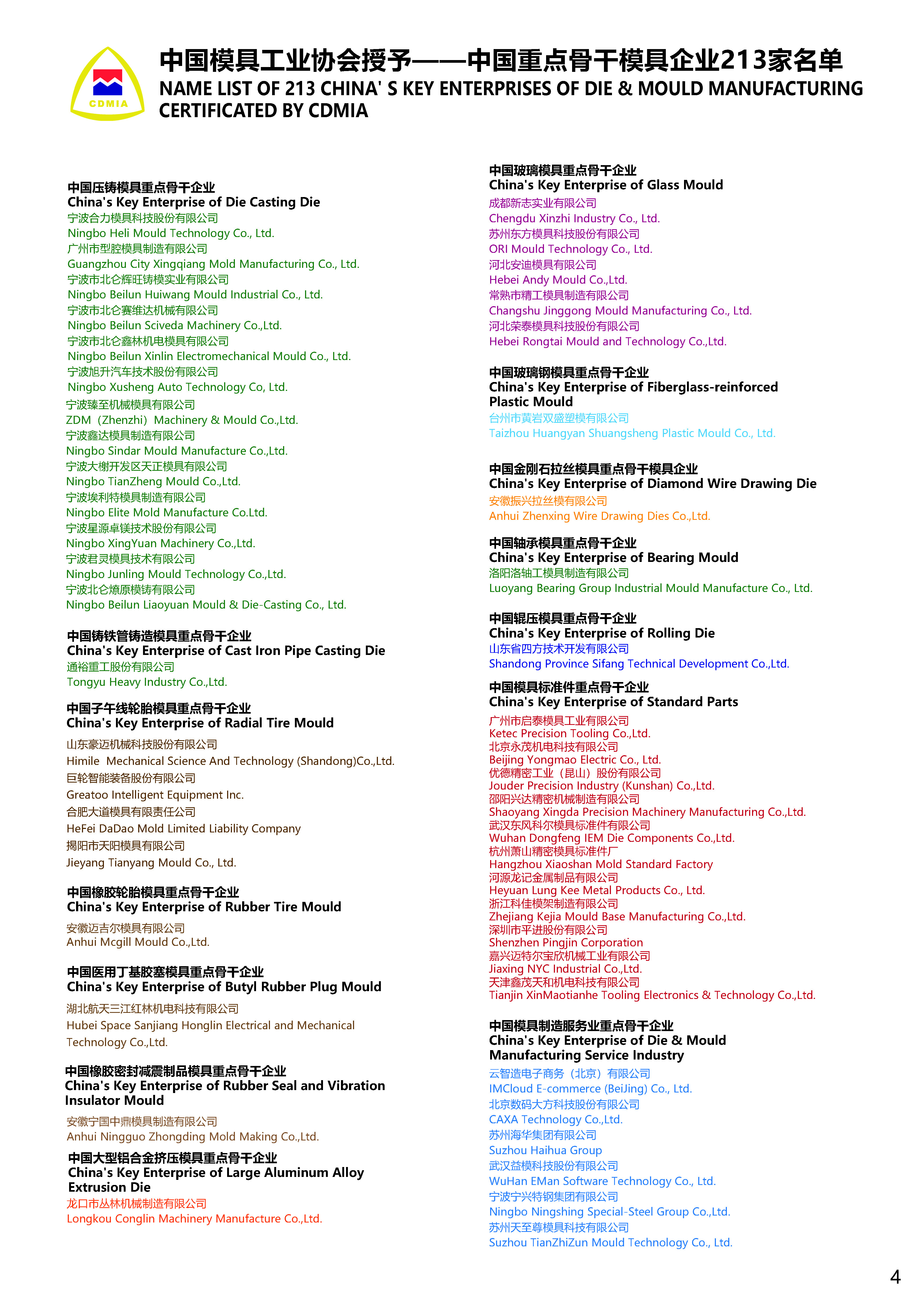 China‘s Key Enterprises of Die & Mould Manufacturing Certificated by CDMIA
