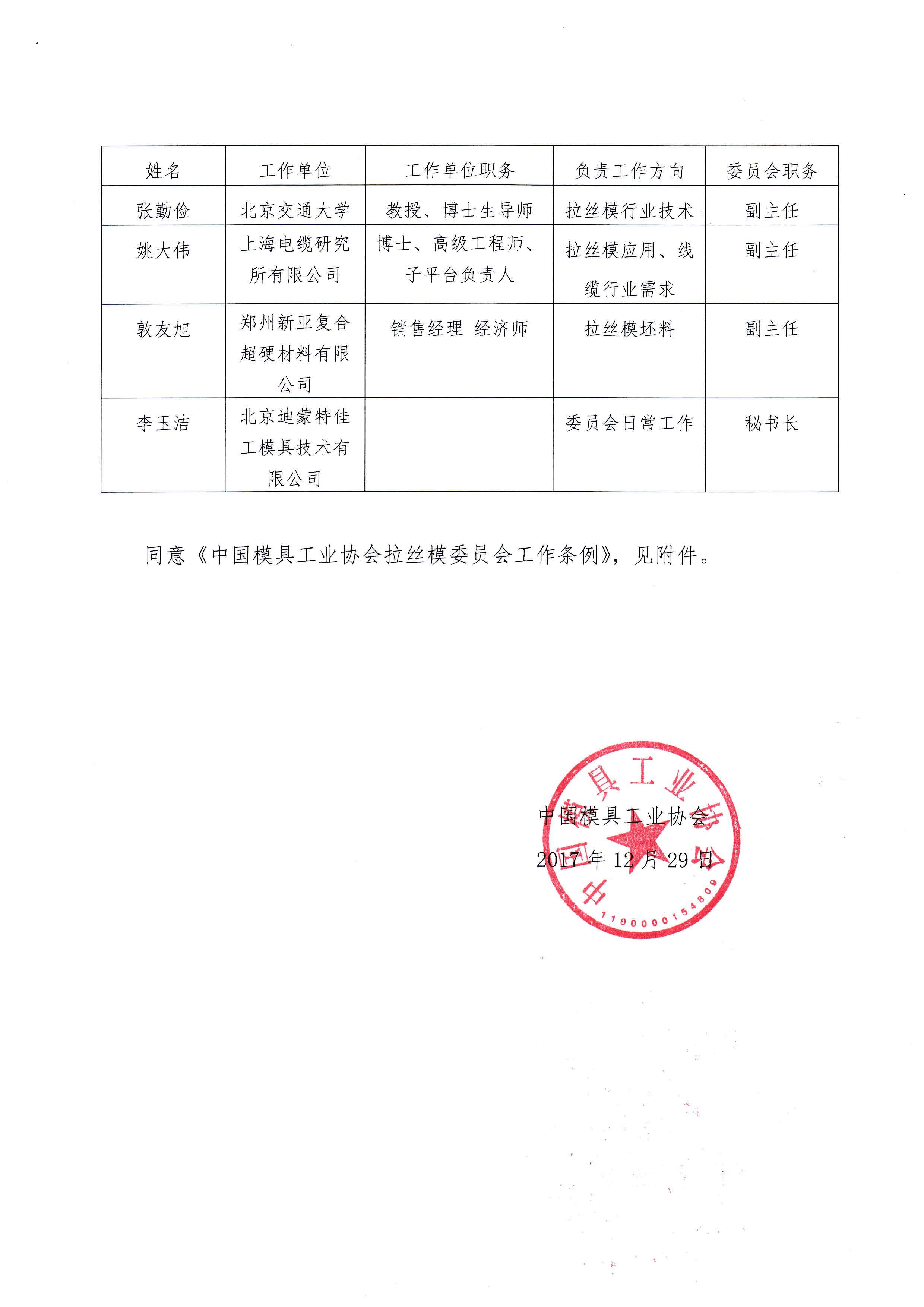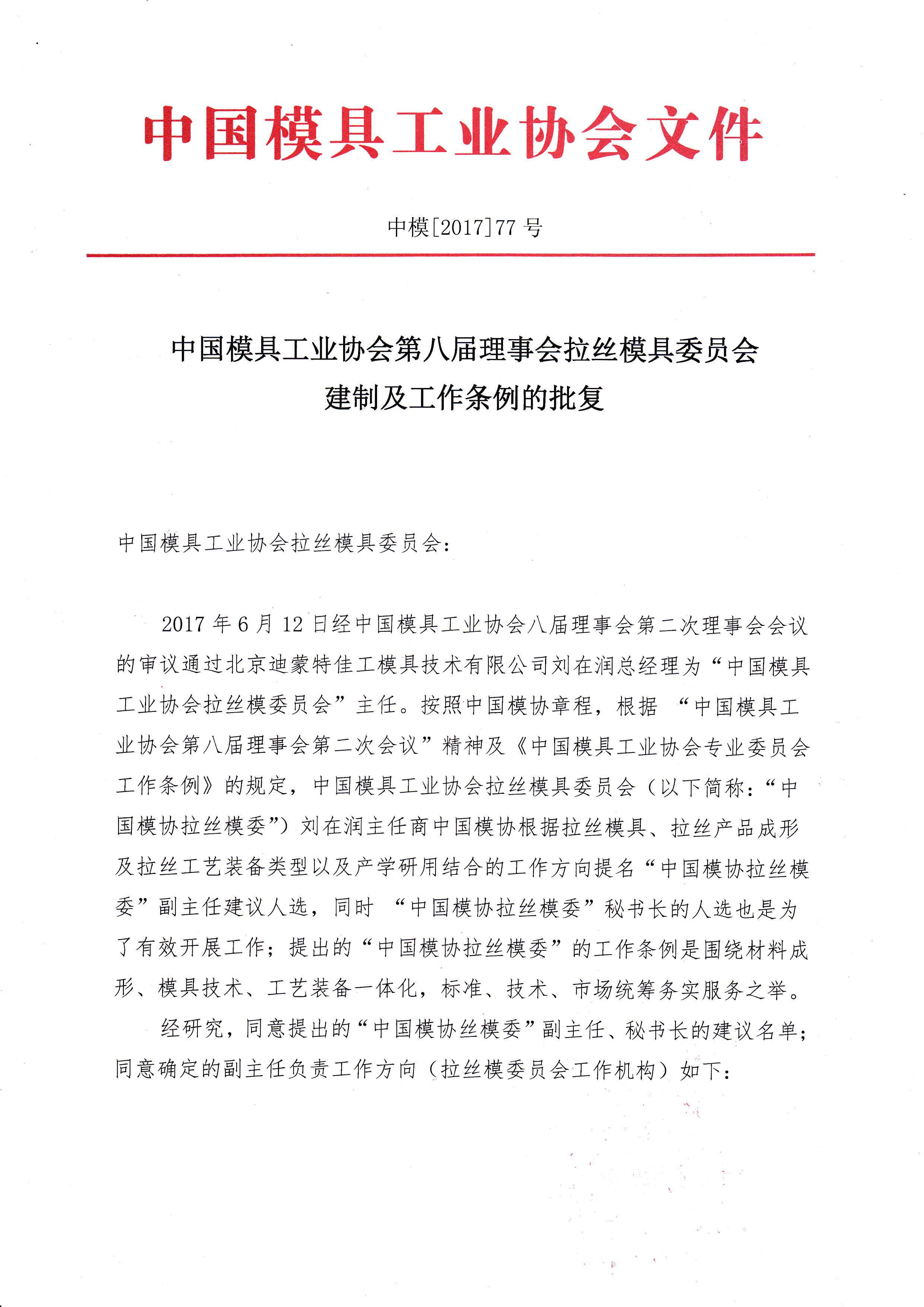 中國模具工業(yè)協(xié)會第八屆理事會拉絲模具委員會建制及工作條例的批復(fù)