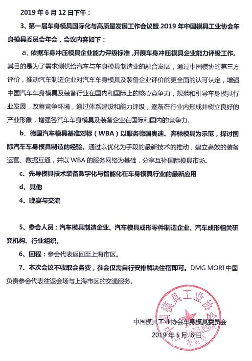 第一屆車身模具國際化與高質量發展工作會議暨2019年中國模協車身模具委員會年會邀請函