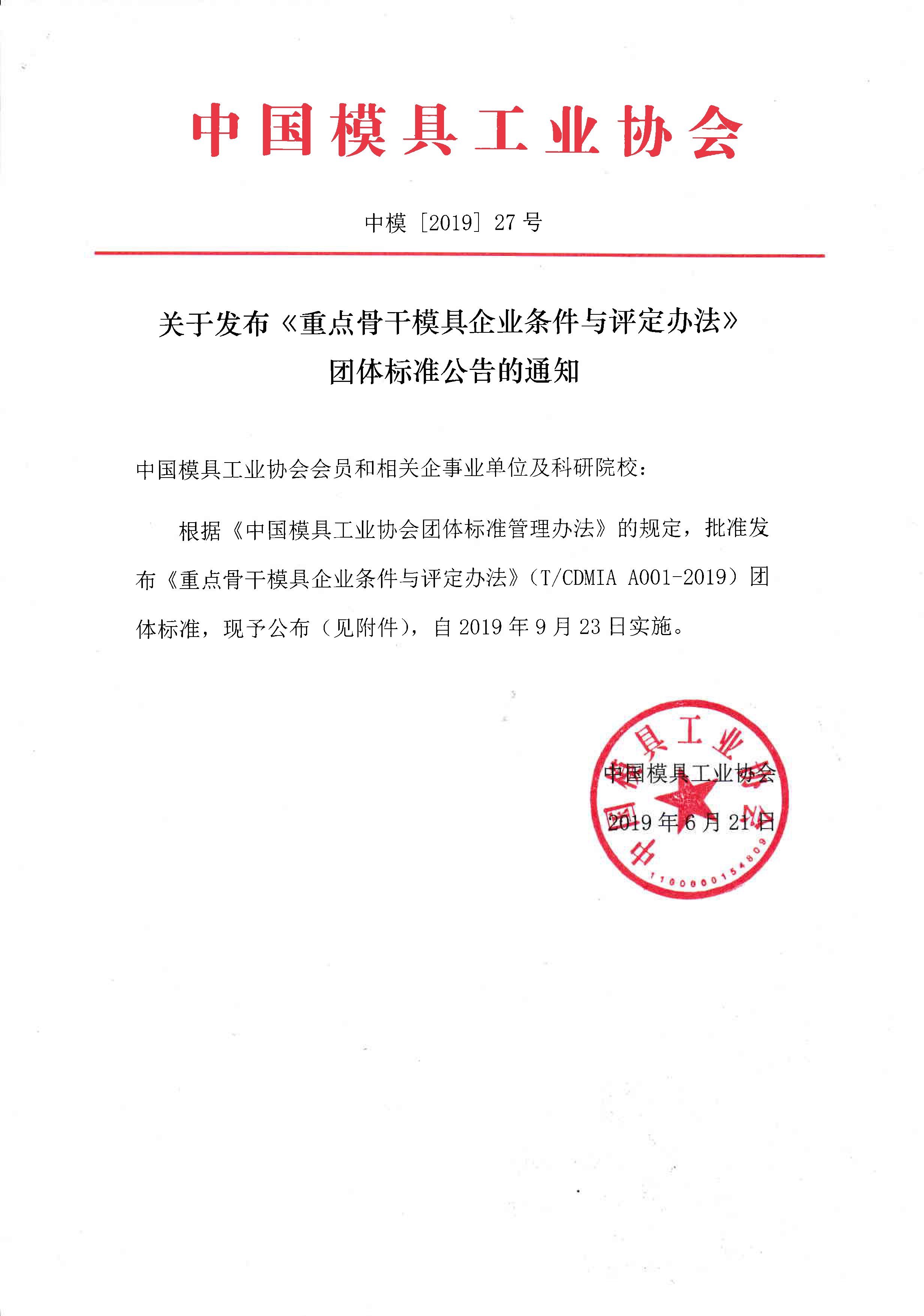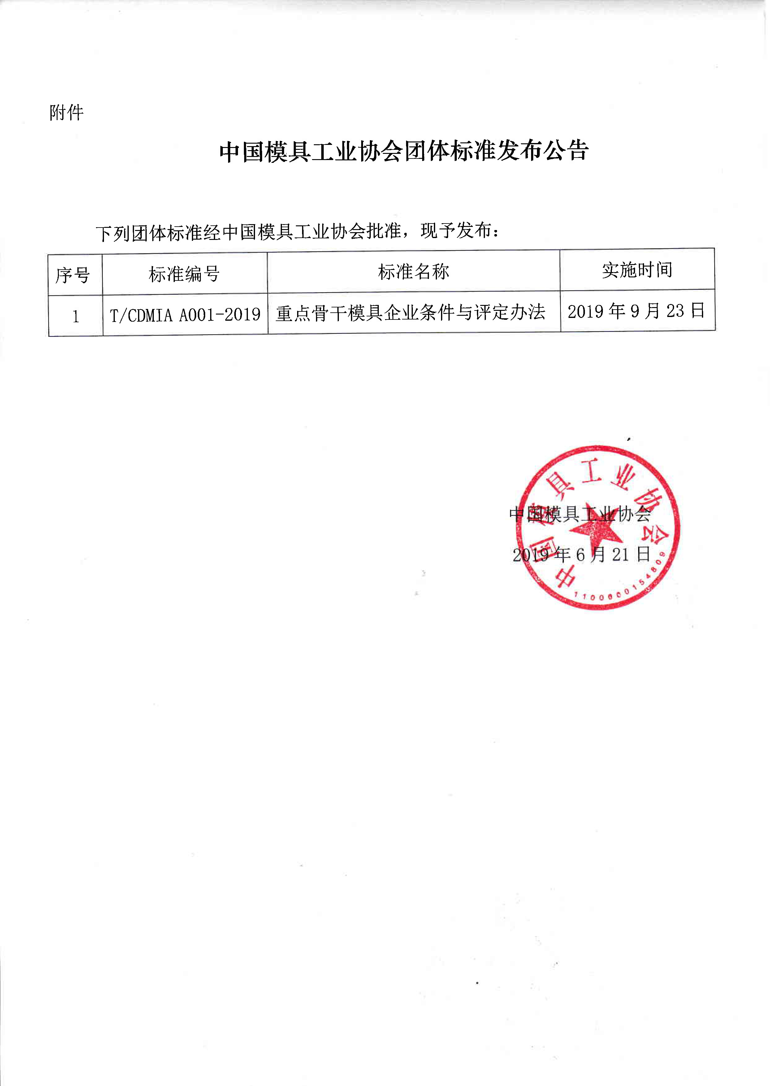 關(guān)于發(fā)布《重點(diǎn)骨干模具企業(yè)條件與評定辦法》團(tuán)體標(biāo)準(zhǔn)公告的通知