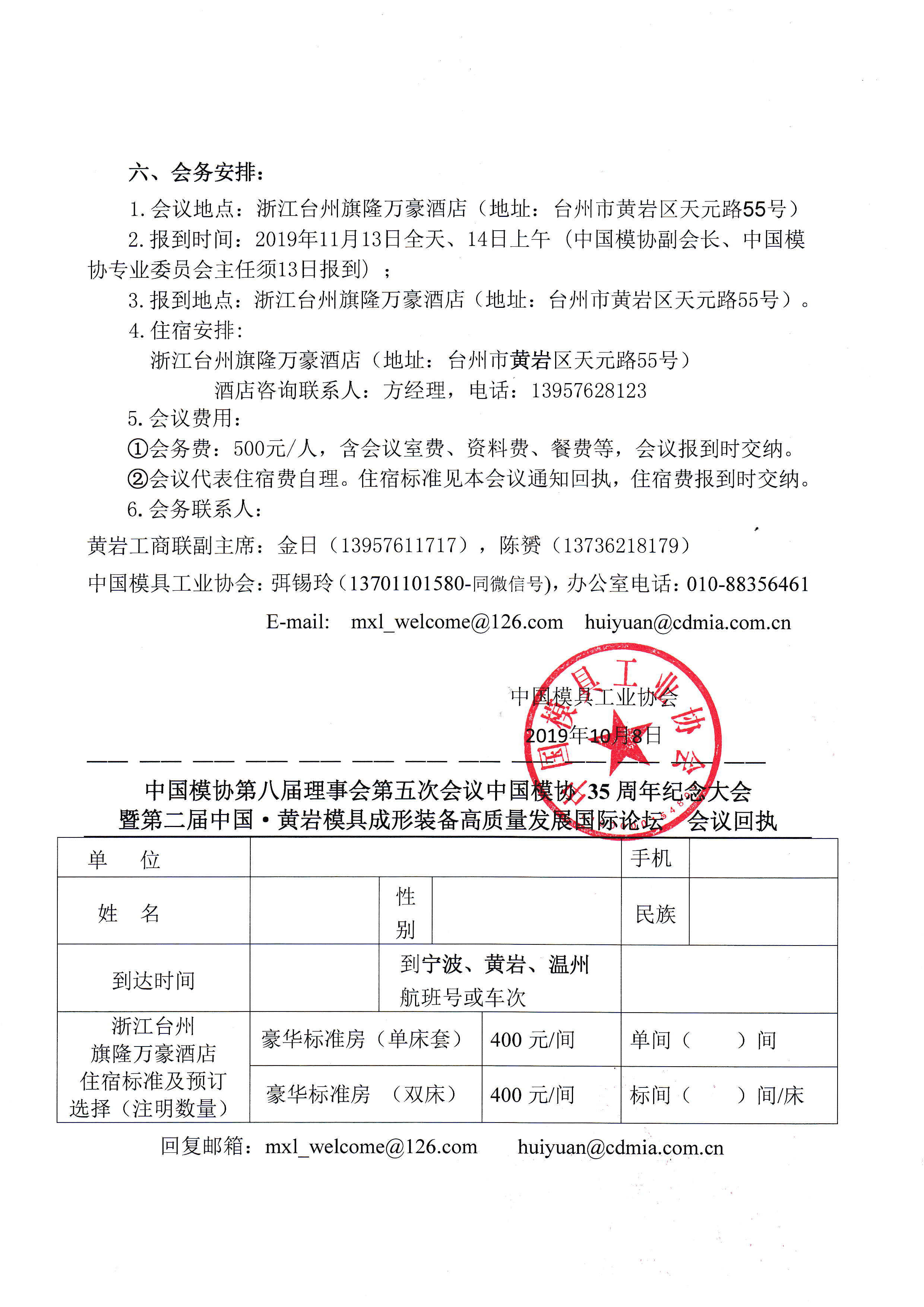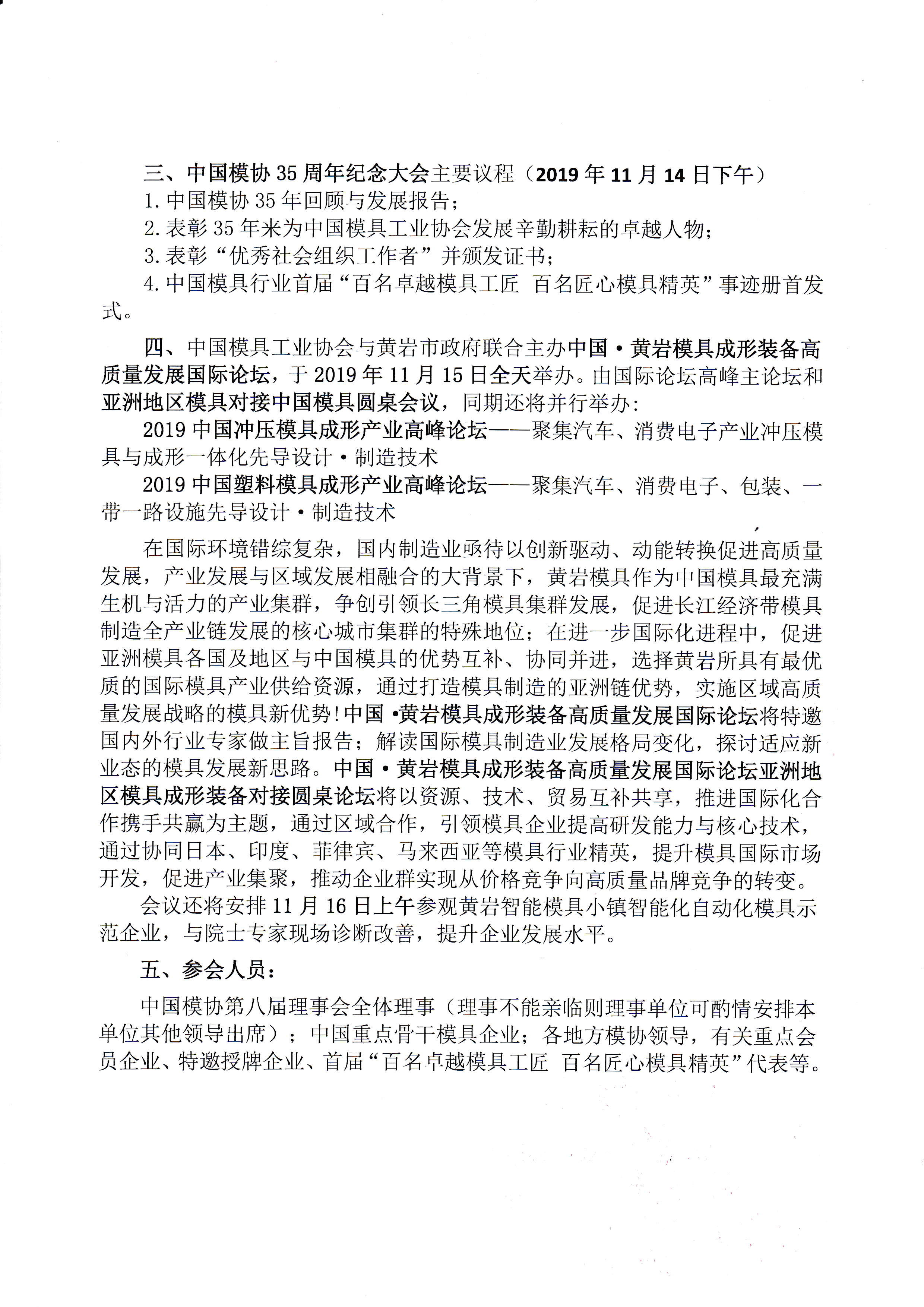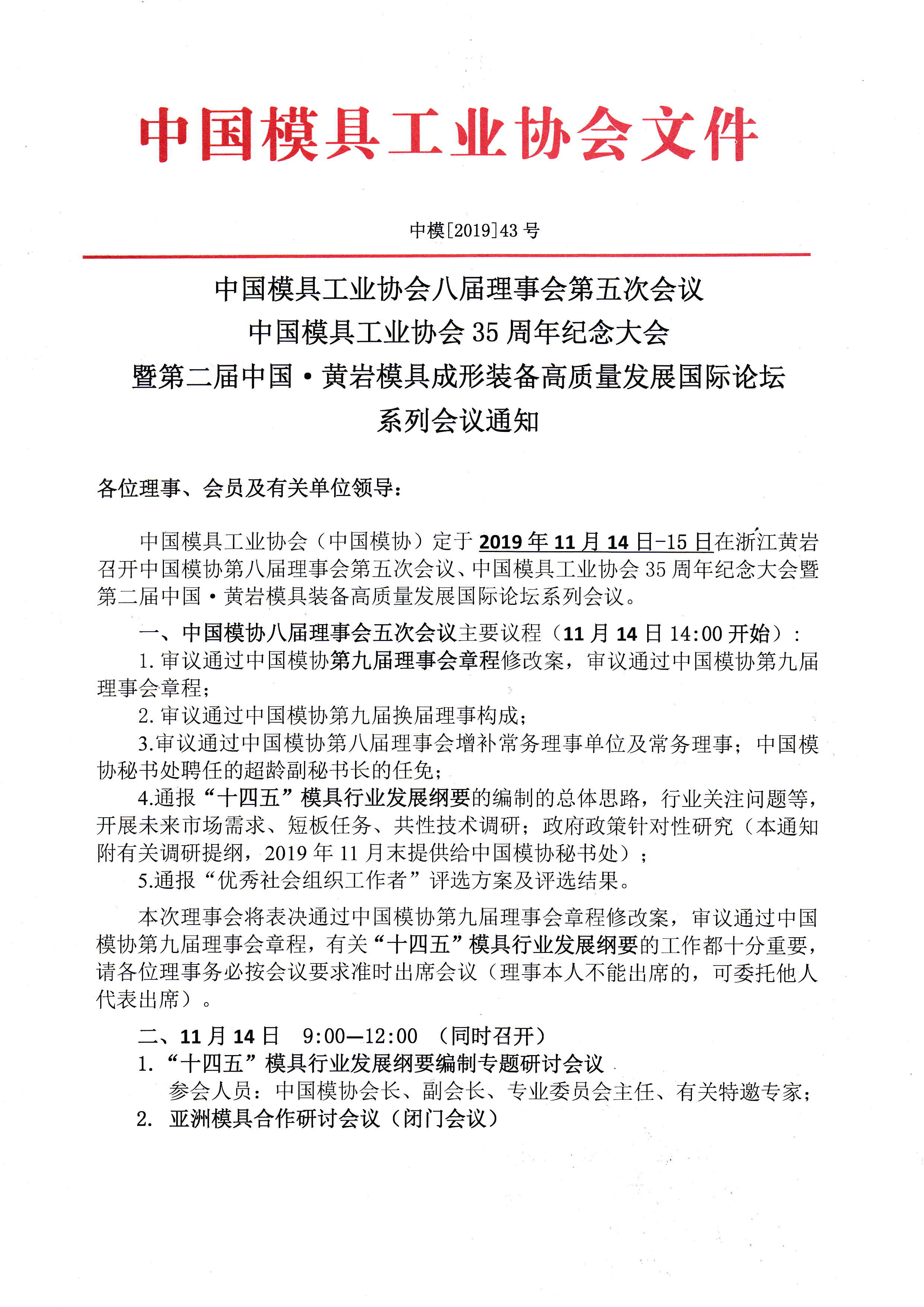 中國模具工業(yè)協(xié)會八屆理事會第五次會議 中國模具工業(yè)協(xié)會35周年紀念大會暨第二屆中國黃巖模具裝備高質(zhì)量發(fā)展國際論壇系列會議通知
