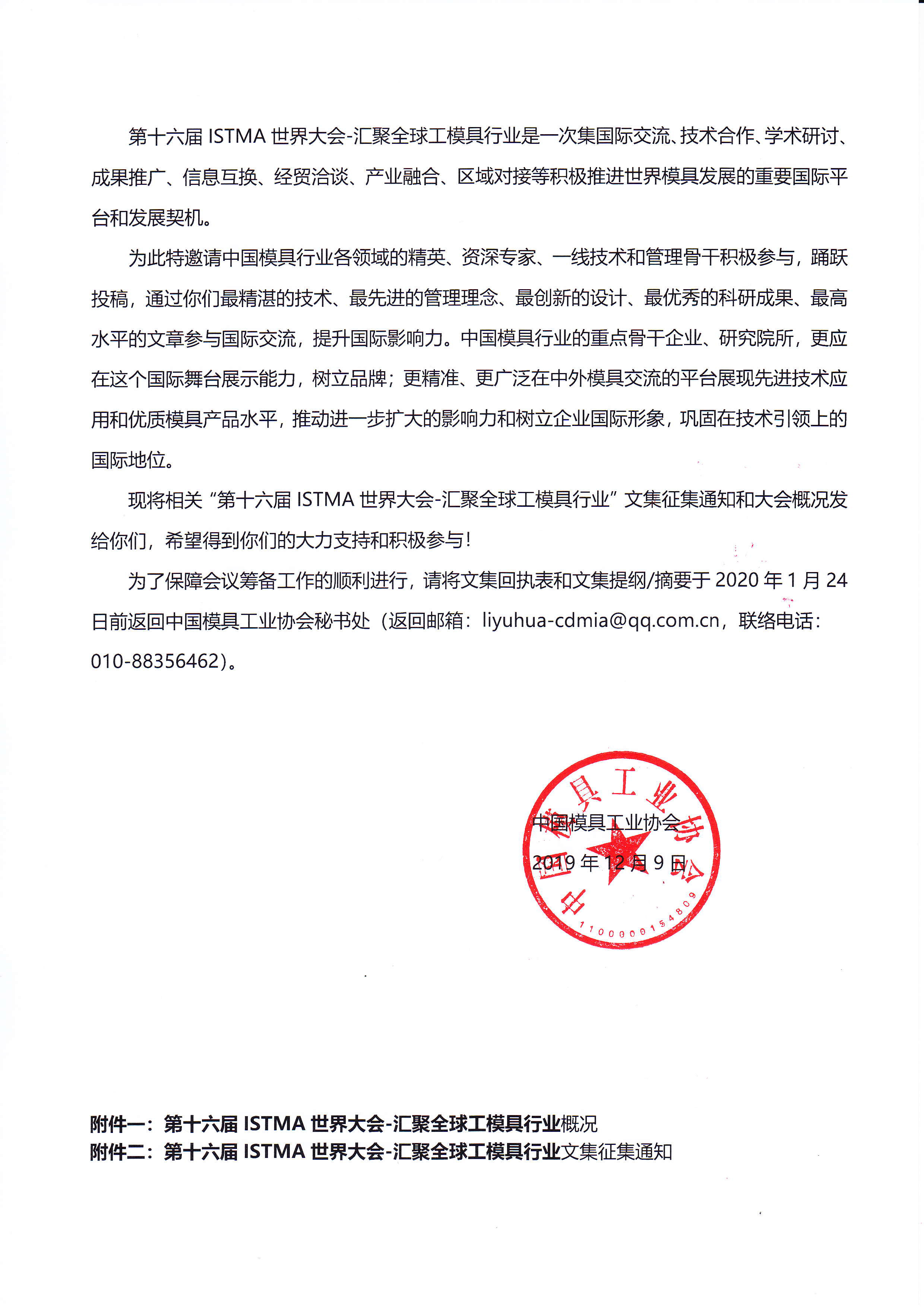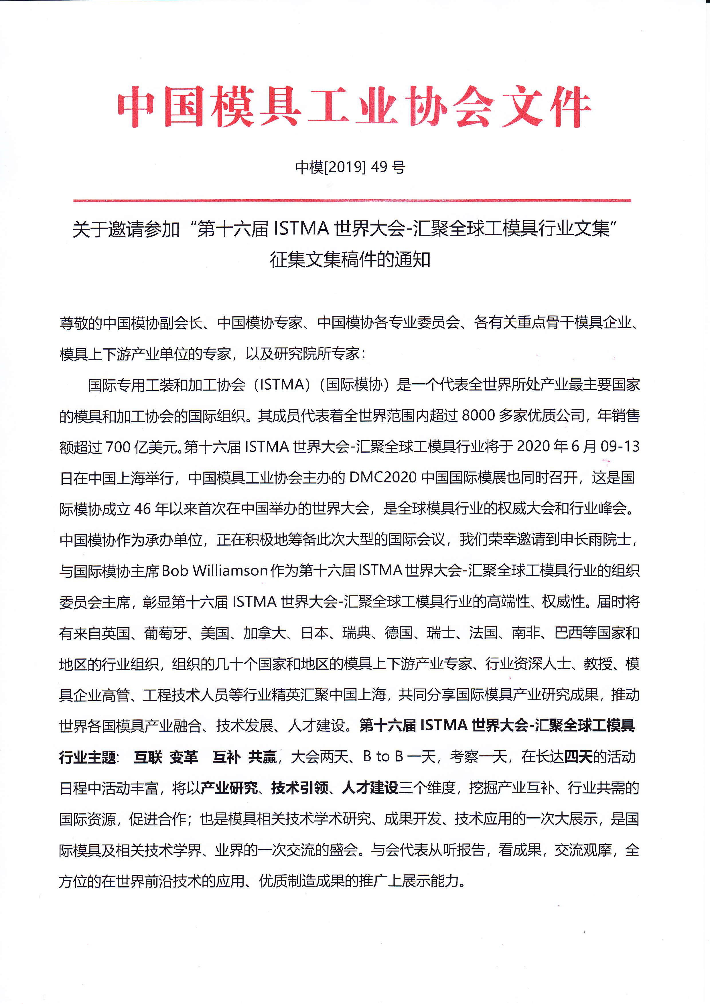 關(guān)于邀請參加“第十六屆ISTMA世界大會——匯聚全球工模具行業(yè)文集”征集文集稿件的通知