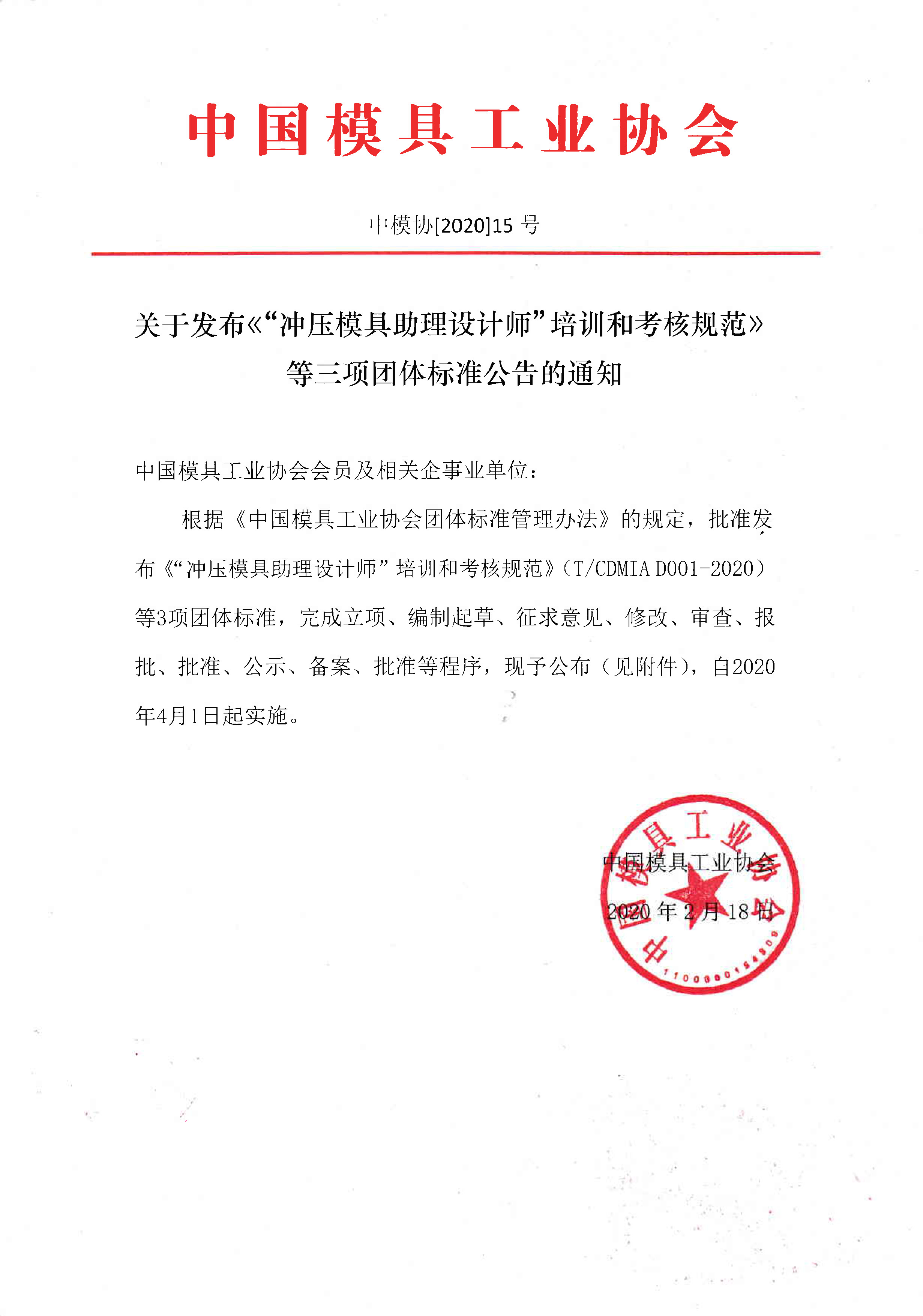 關(guān)于發(fā)布《“沖壓模具助理設(shè)計師”培訓(xùn)和考核規(guī)范》等三項(xiàng)團(tuán)體標(biāo)準(zhǔn)公告的通知