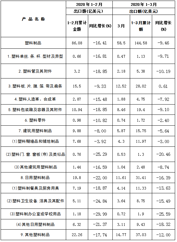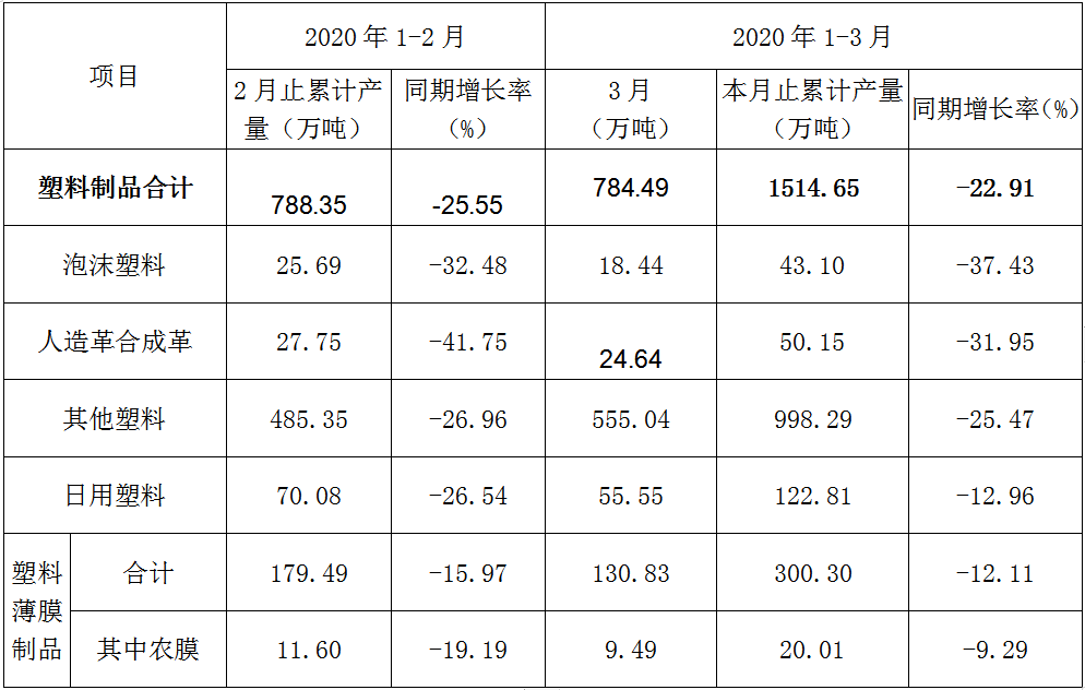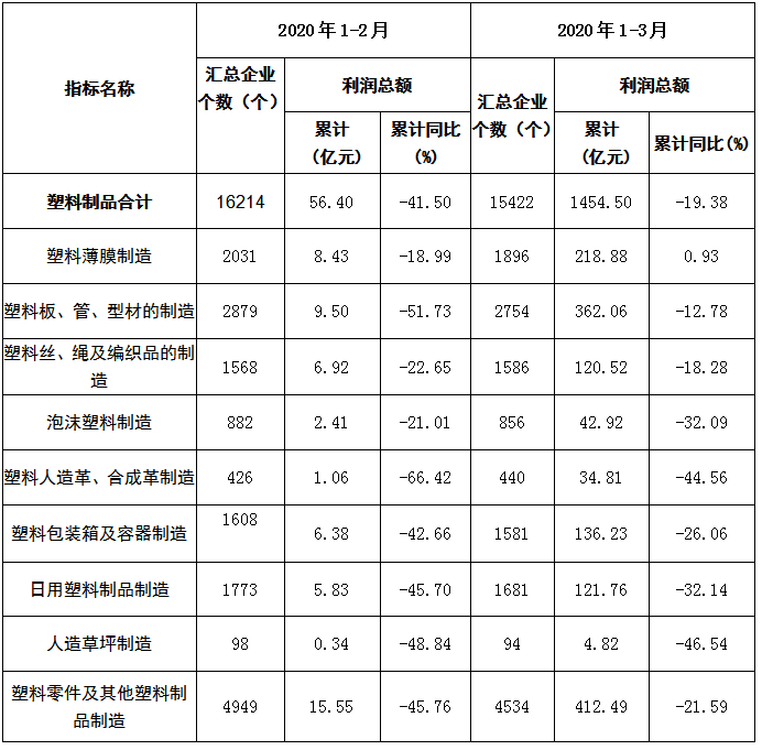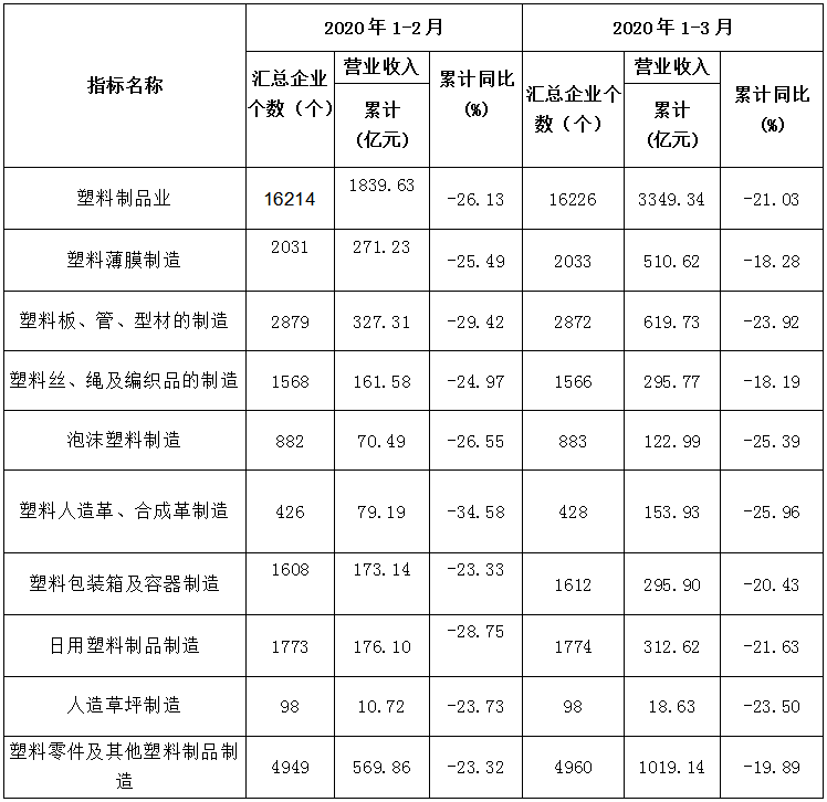 2020年1-3月,全國塑料制品行業匯總統計企業累計完成產量1514.65萬噸,同比下降22.91%,增長率比上年同期降低了26.43%;16226家規模以上企業營業收入3349.34億元,同比下降21.03%,增長率比上年同期降低了29.91%;實現利潤145.45億元,同比下降19.38%,增長率比上年同期降低了35.45%;營業收入利潤率為4.34%,比上年同期下降了0.03%;塑料制品累計出口額144.58億美元,同比下降9.46%,增長率比上年同期降低17.04%。(統計口徑不一,各年數據不可直接相比)