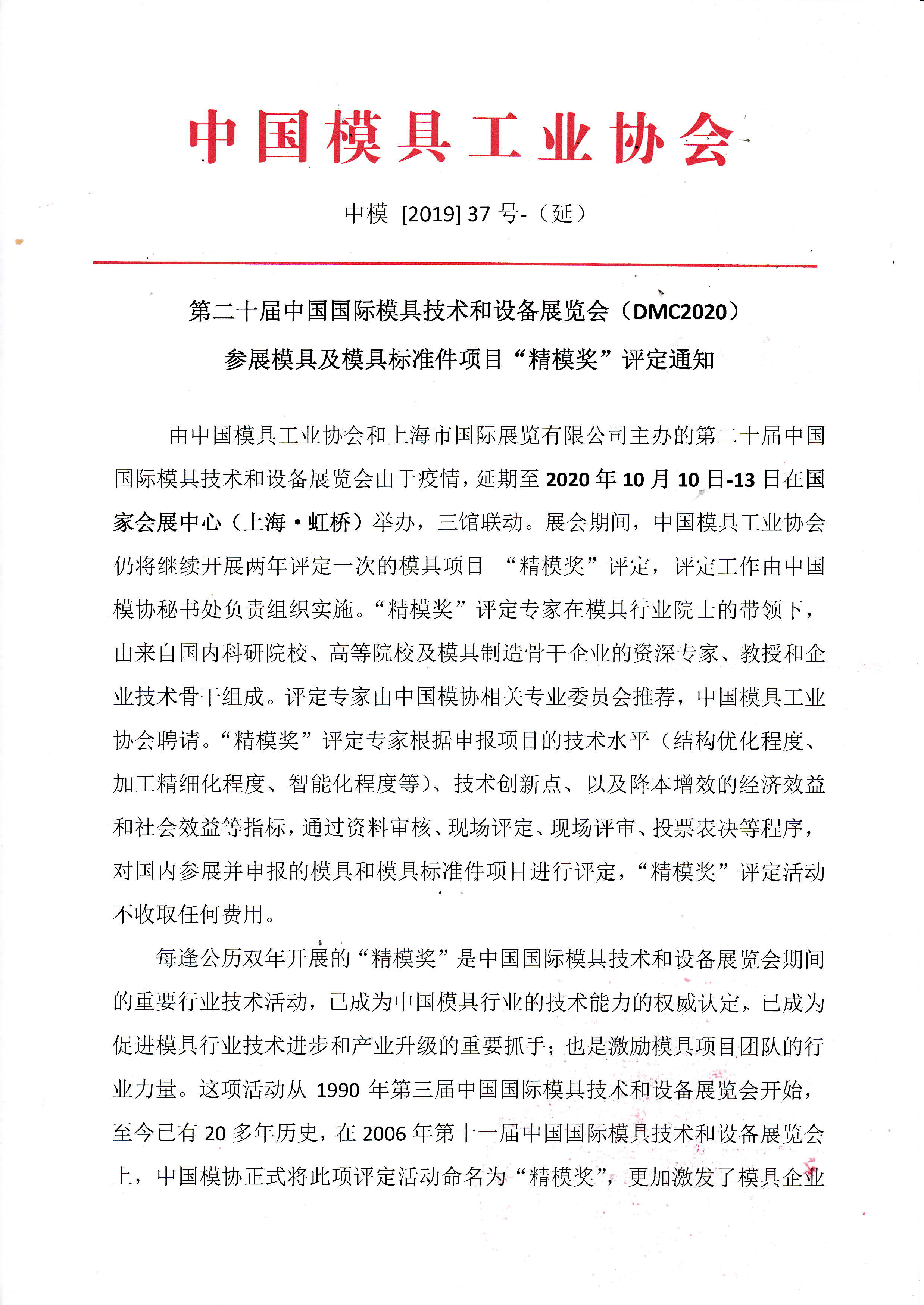 DMC2020“精模獎”評定延期通知