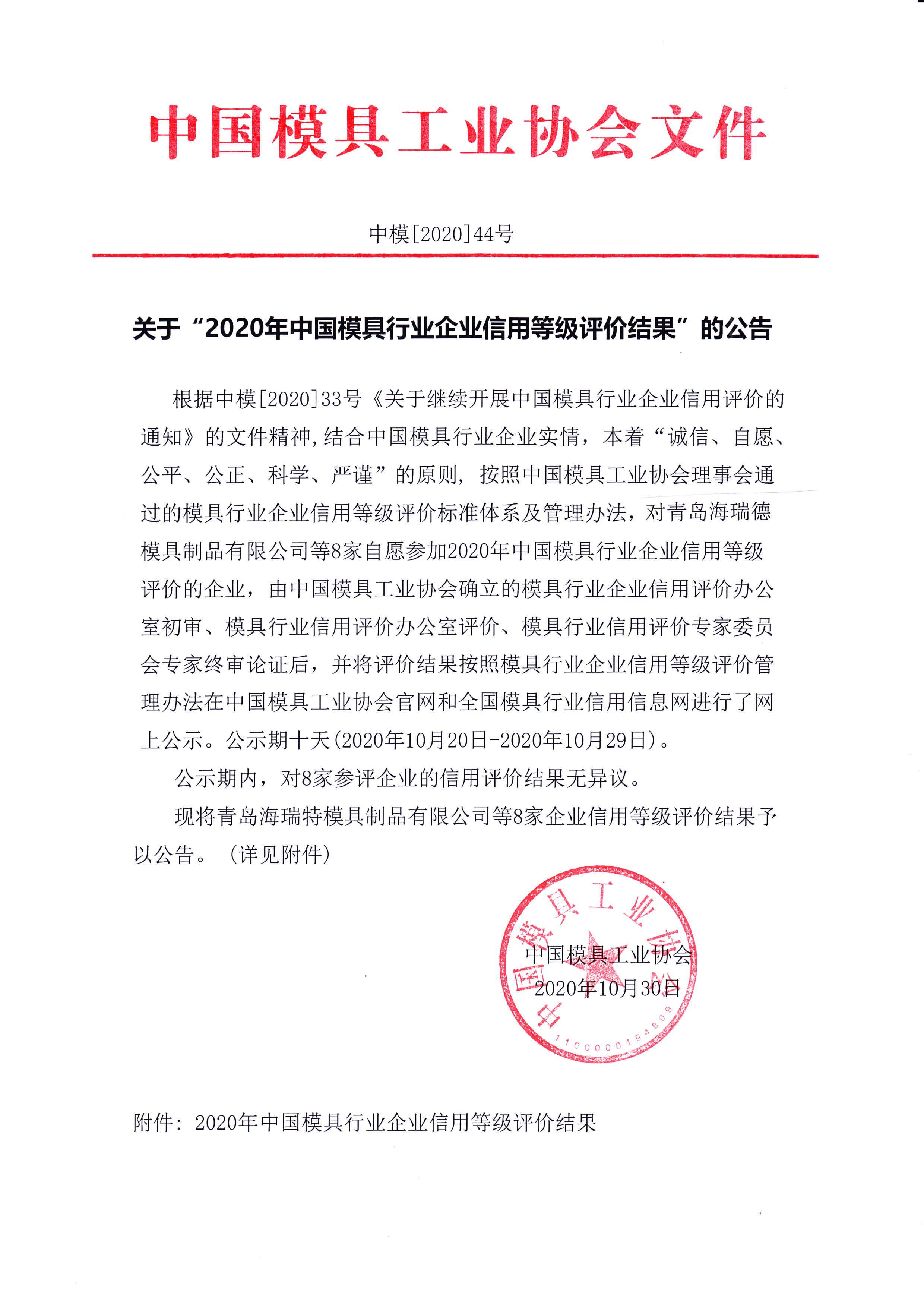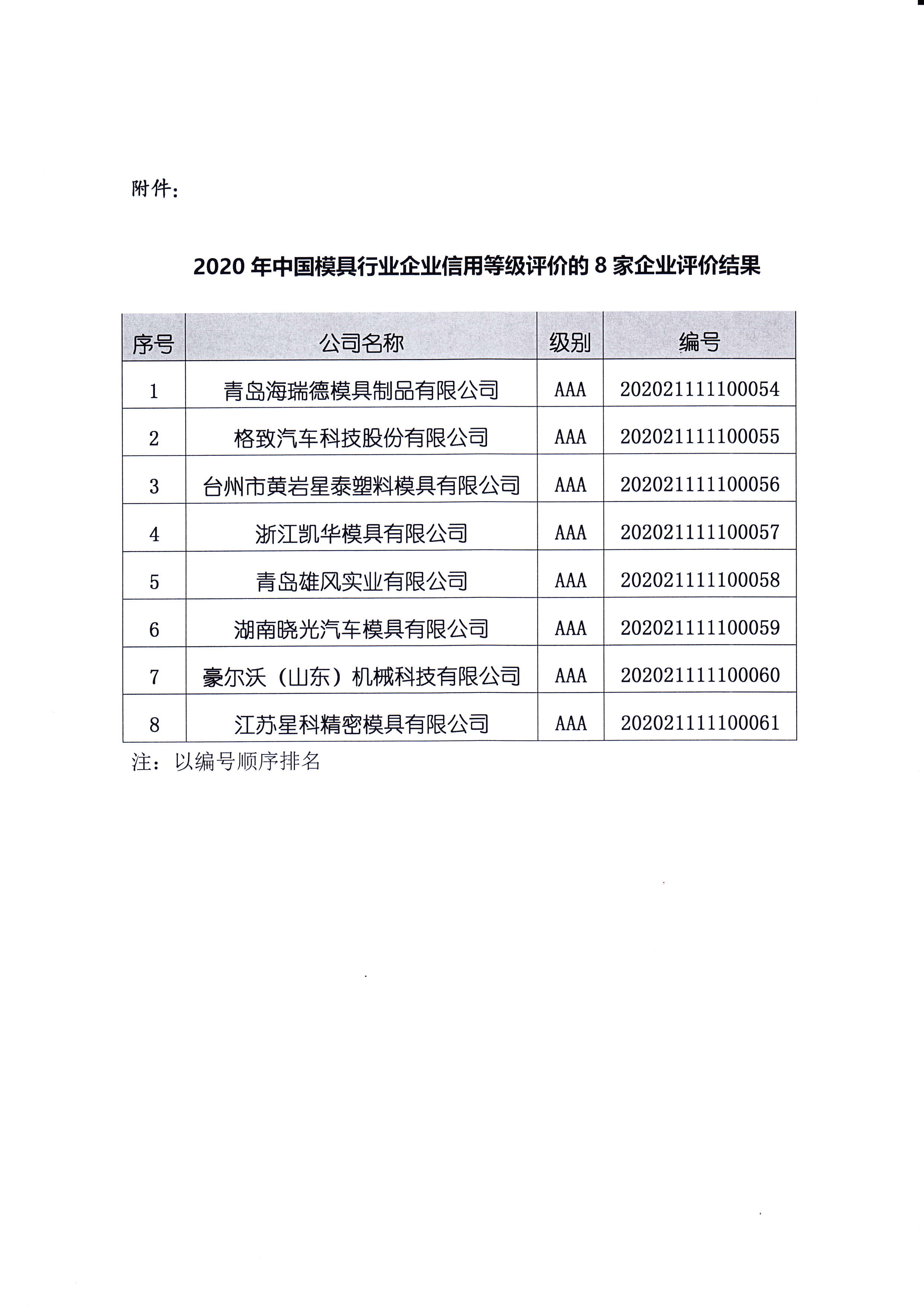 關于“2020年中國模具行業企業信用等級評價結果”的公告