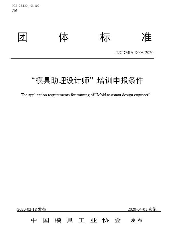 中國模協(xié)標(biāo)準(zhǔn)D003-模具助理設(shè)計(jì)師培訓(xùn)申報(bào)條件-2020