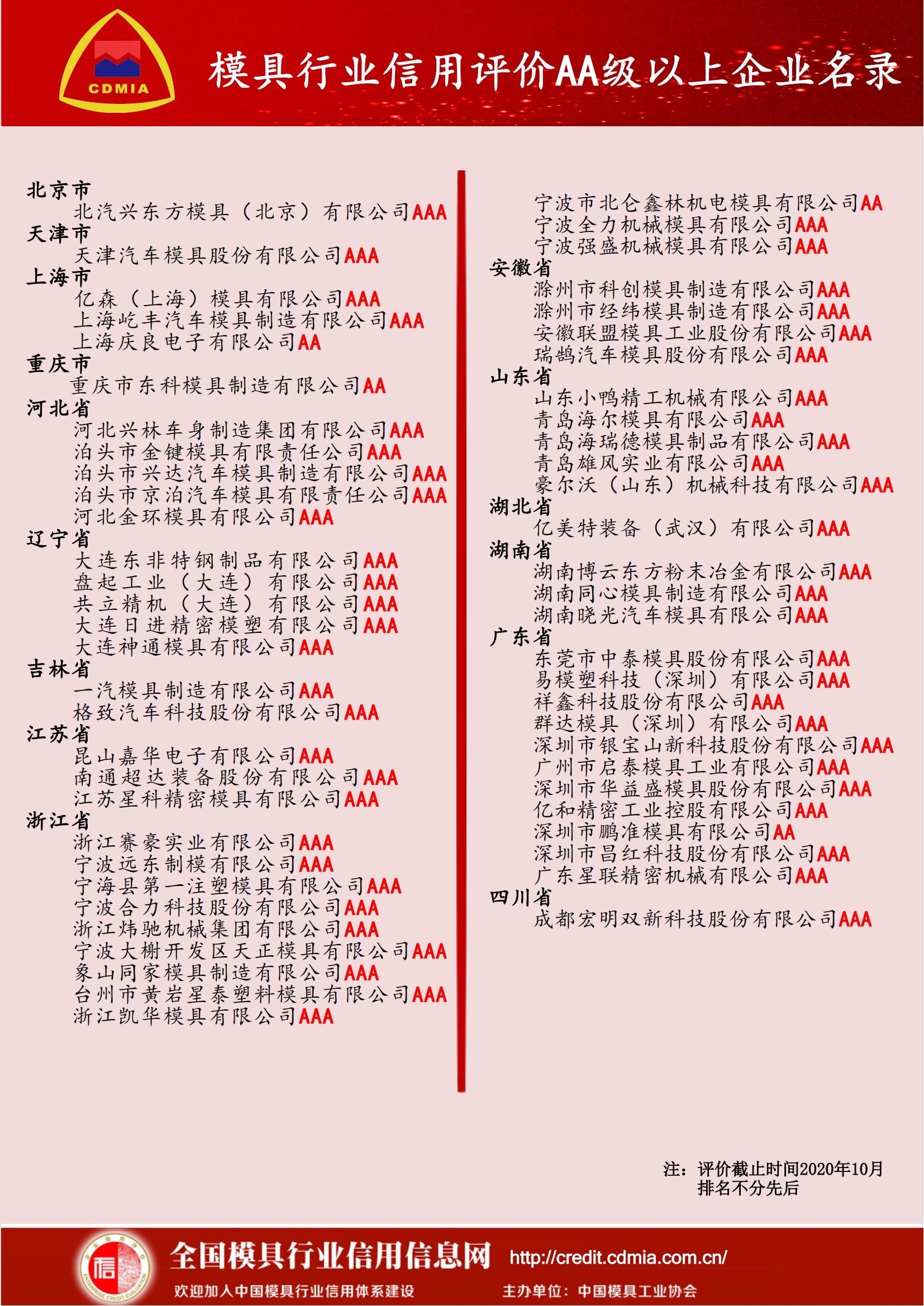 模具行業(yè)信用評價AA級以上企業(yè)名錄
