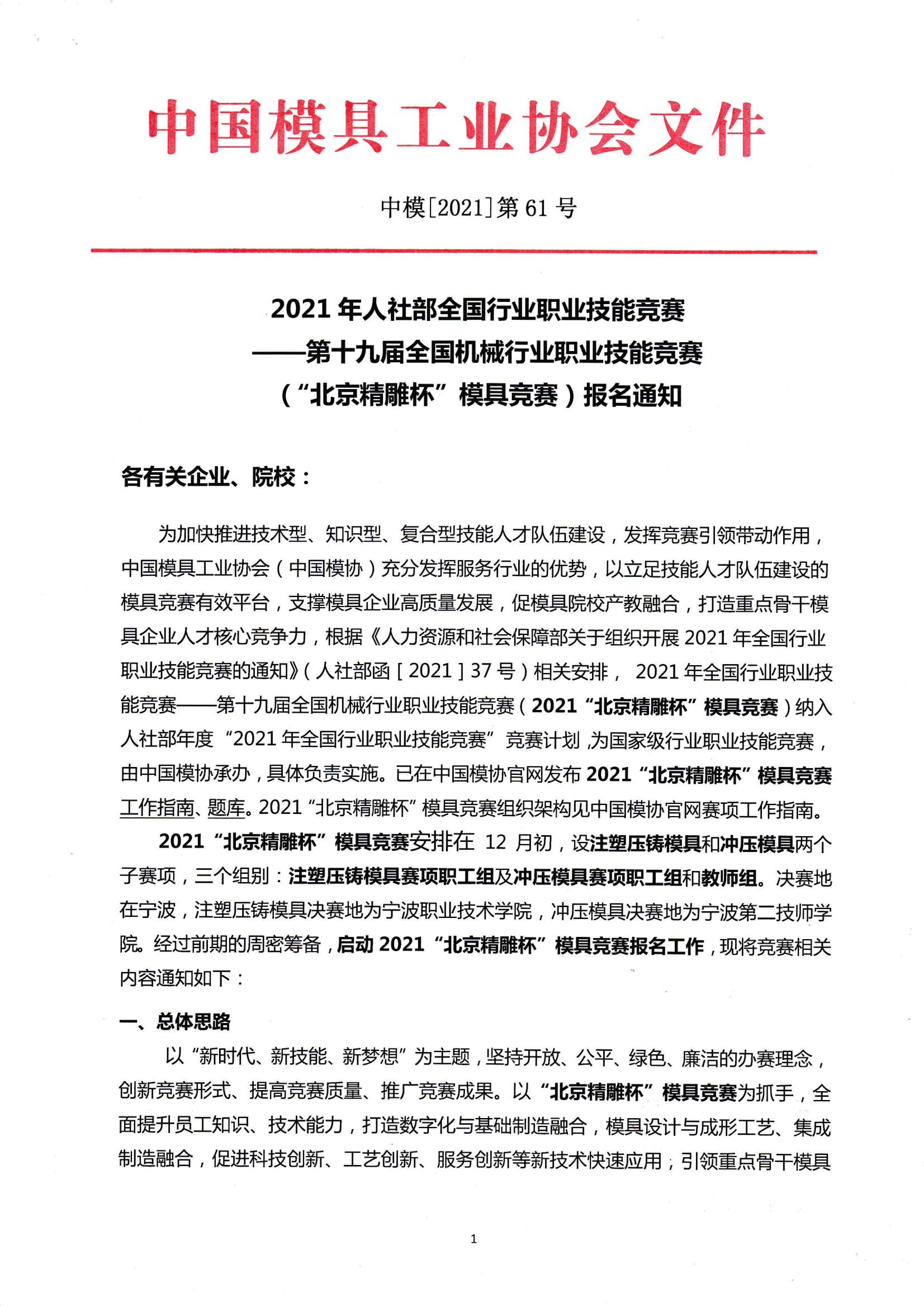 2021年人社部全國行業(yè)職業(yè)技能競賽——第十九屆全國機械行業(yè)職業(yè)技能競賽(“北京精雕杯”模具競賽)報名通知