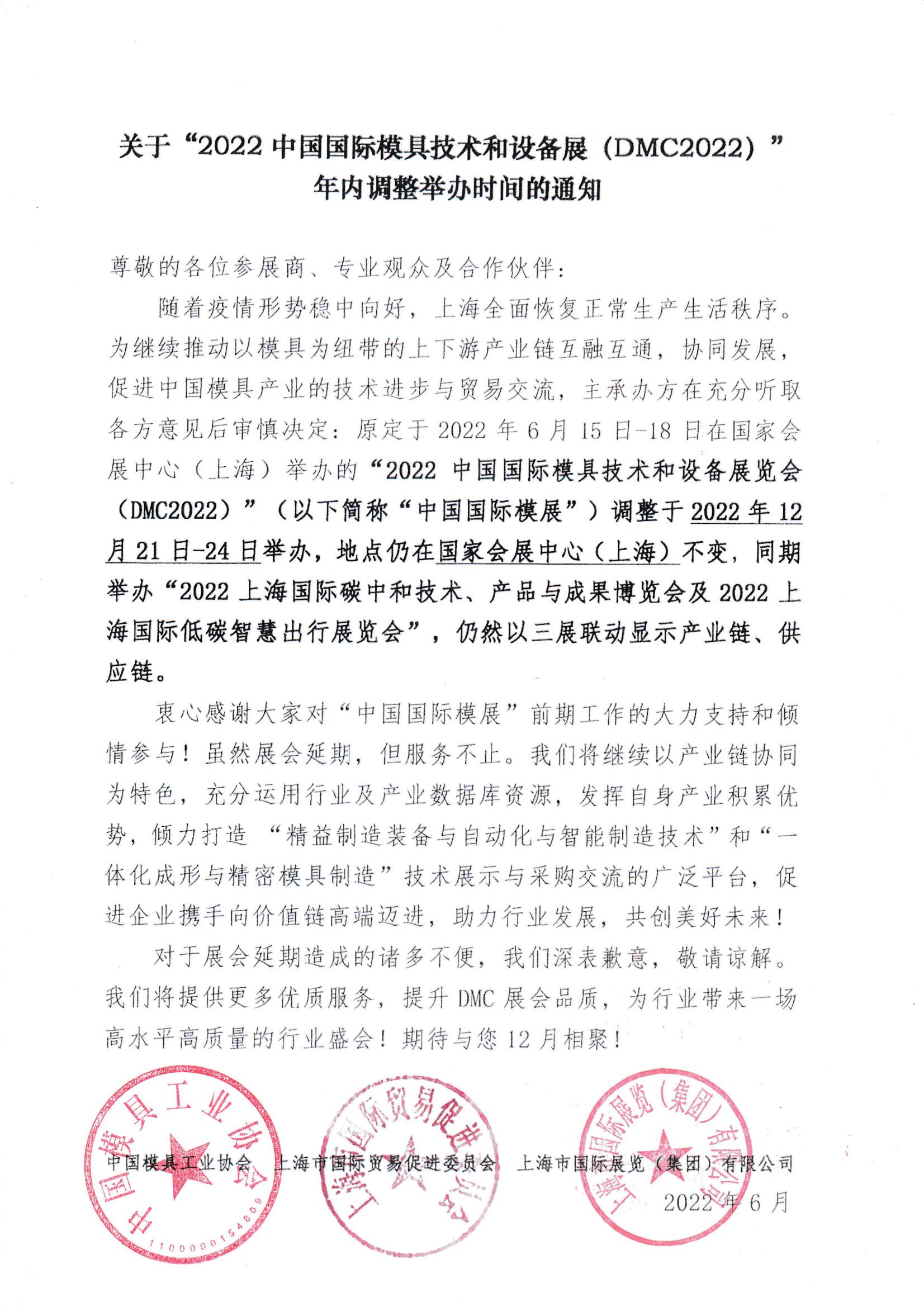 關(guān)于“2022中國(guó)國(guó)際模具技術(shù)和設(shè)備展(DMC2022)年內(nèi)調(diào)整舉辦時(shí)間的通知”