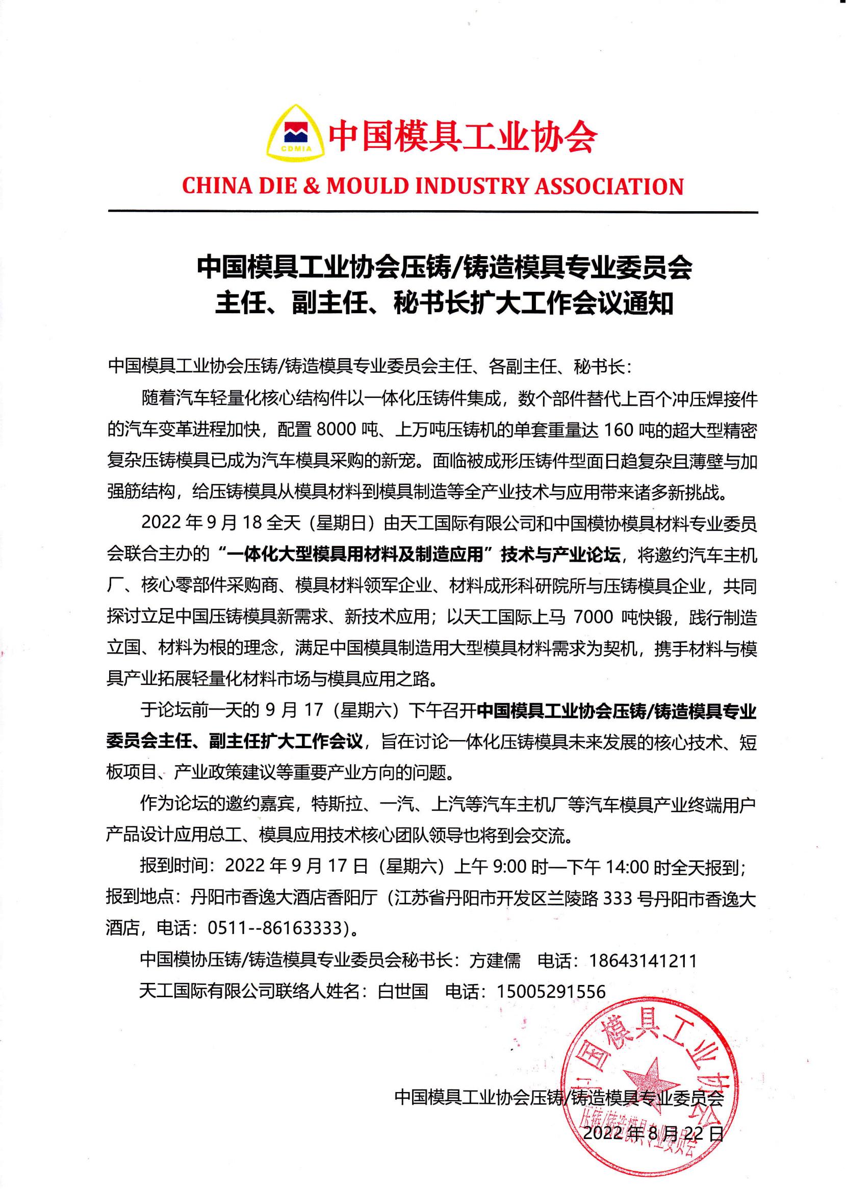2.中國模具工業協會壓鑄/鑄造模具專業委員會主任、副主任工作會議時間:9月17日下午