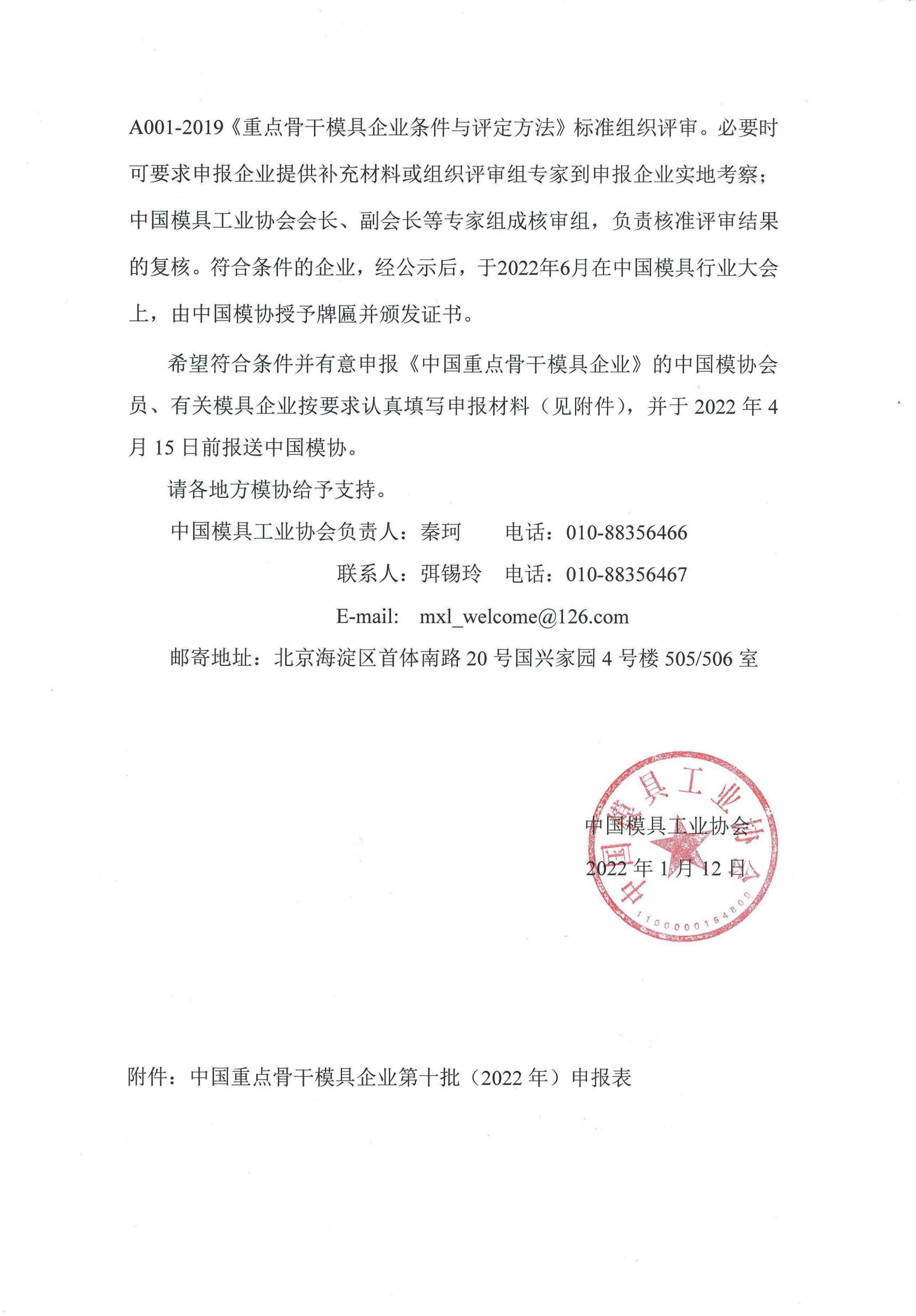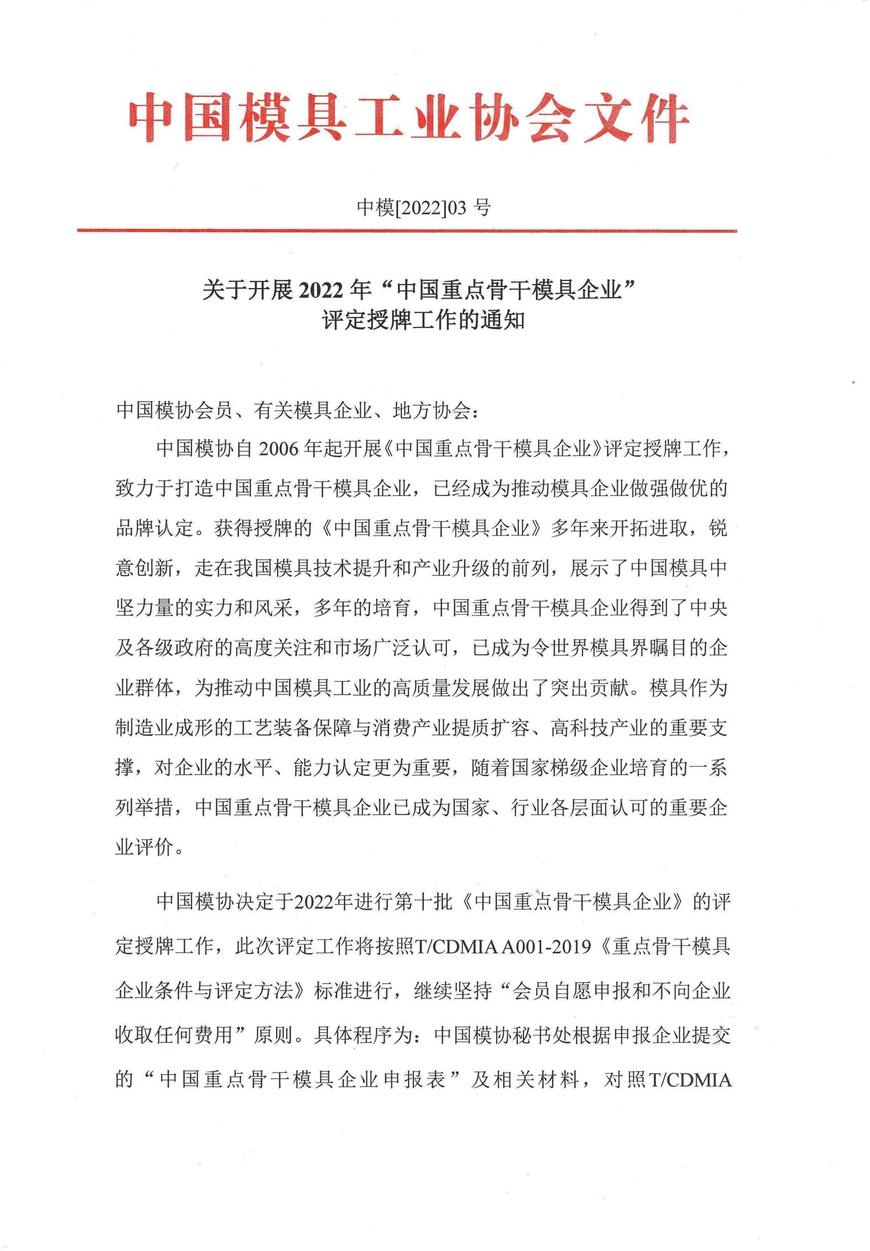 關(guān)于開展2022年“中國重點骨干模具企業(yè)”評定授牌工作的通知
