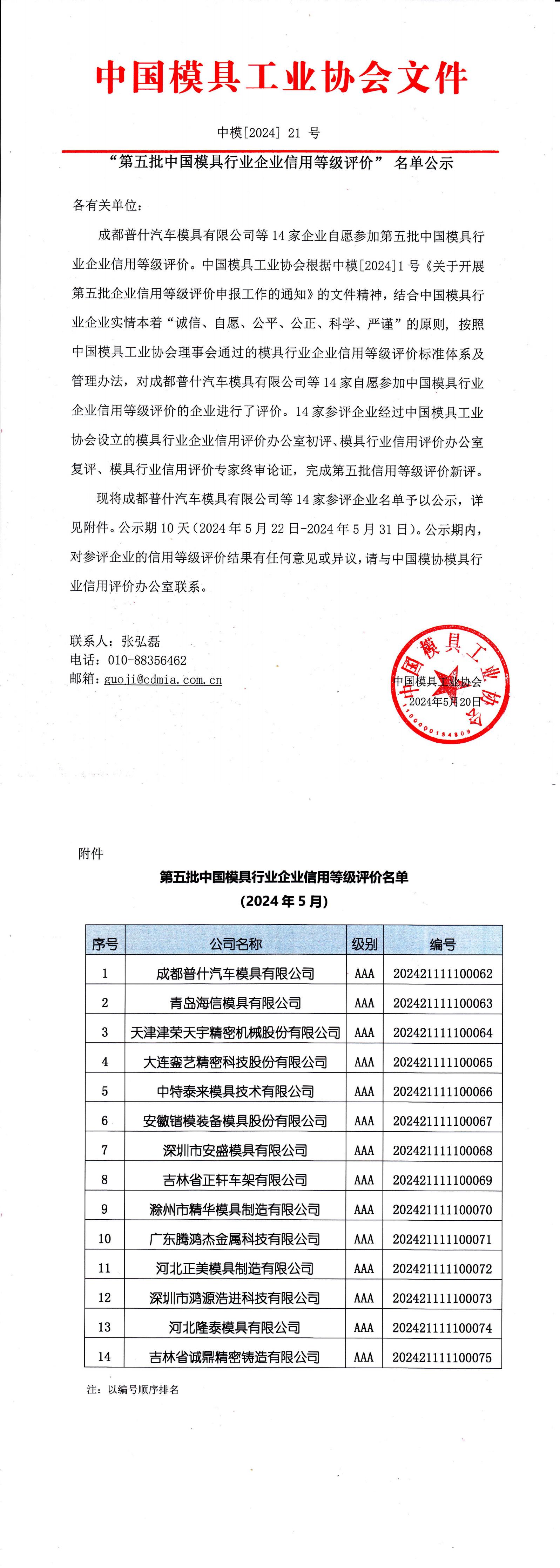 “第五批中國模具行業(yè)企業(yè)信用等級評價”名單公示