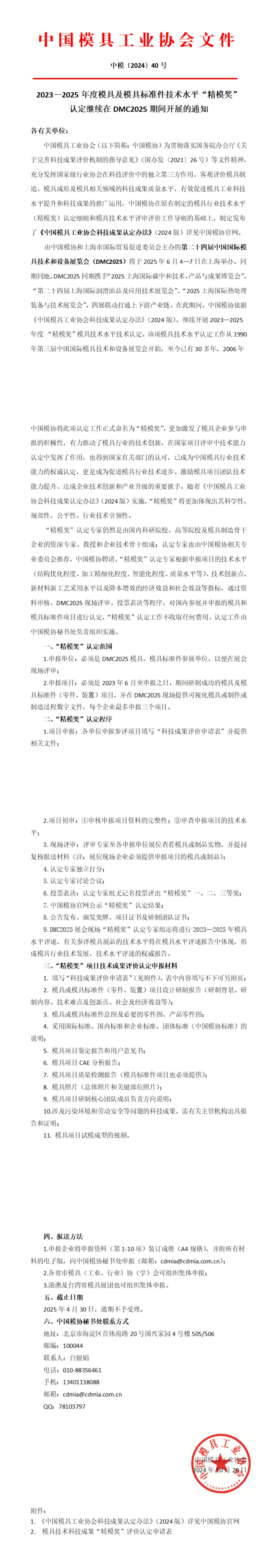 2023-2025年度模具及模具標(biāo)準(zhǔn)件技術(shù)水平“精模獎”認(rèn)定繼續(xù)在DMC2025期間開展的通知