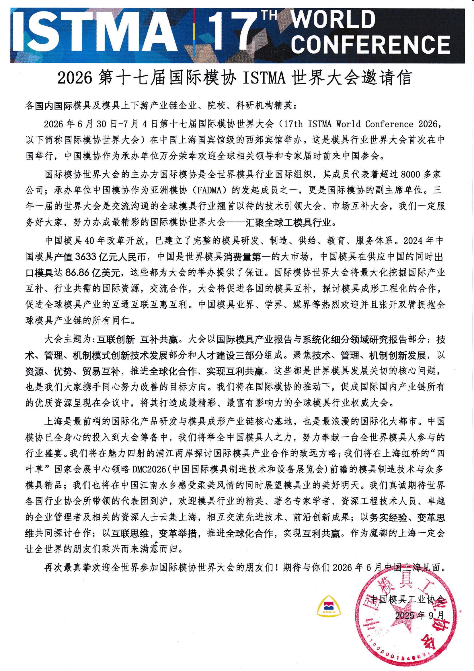 2026第十七屆國(guó)際模協(xié)ISTMA世界大會(huì)邀請(qǐng)信